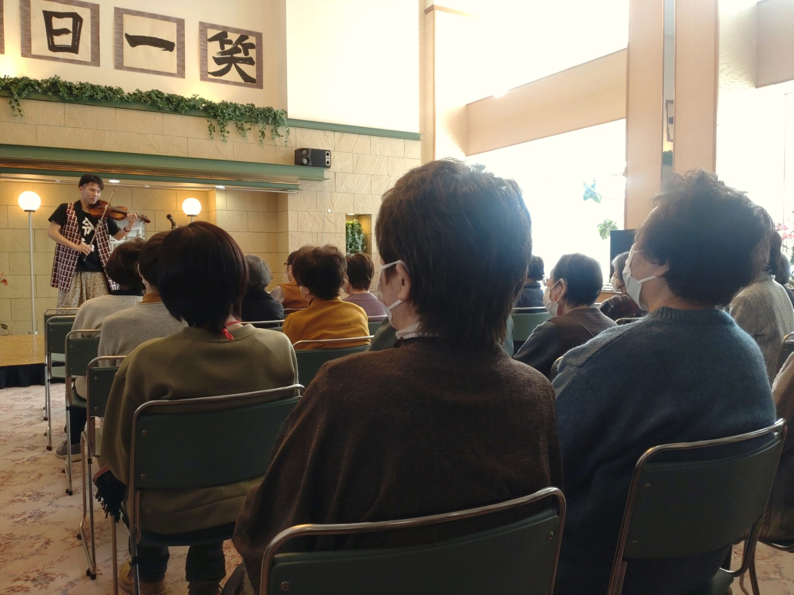 ヴァイオリンの心温まる音色がロビーの空間を包み込み、ご入居者様の心を癒すひとときとなりました。