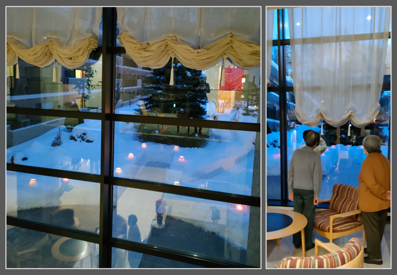 入居者の皆さまは窓からこの美しい光景を眺め、心温まるひとときを過ごされました。キャンドルの柔らかな光が、冬の冷たい空気に包まれた中庭に温かみを添え、
