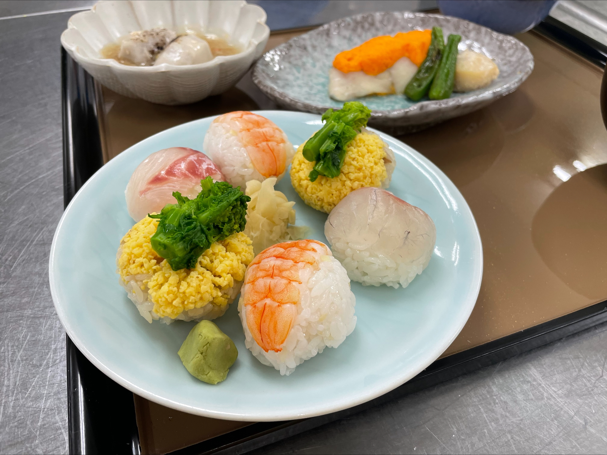 ■手毬寿司3種~菜の花と玉子そぼろ•鯛•海老と新生姜~