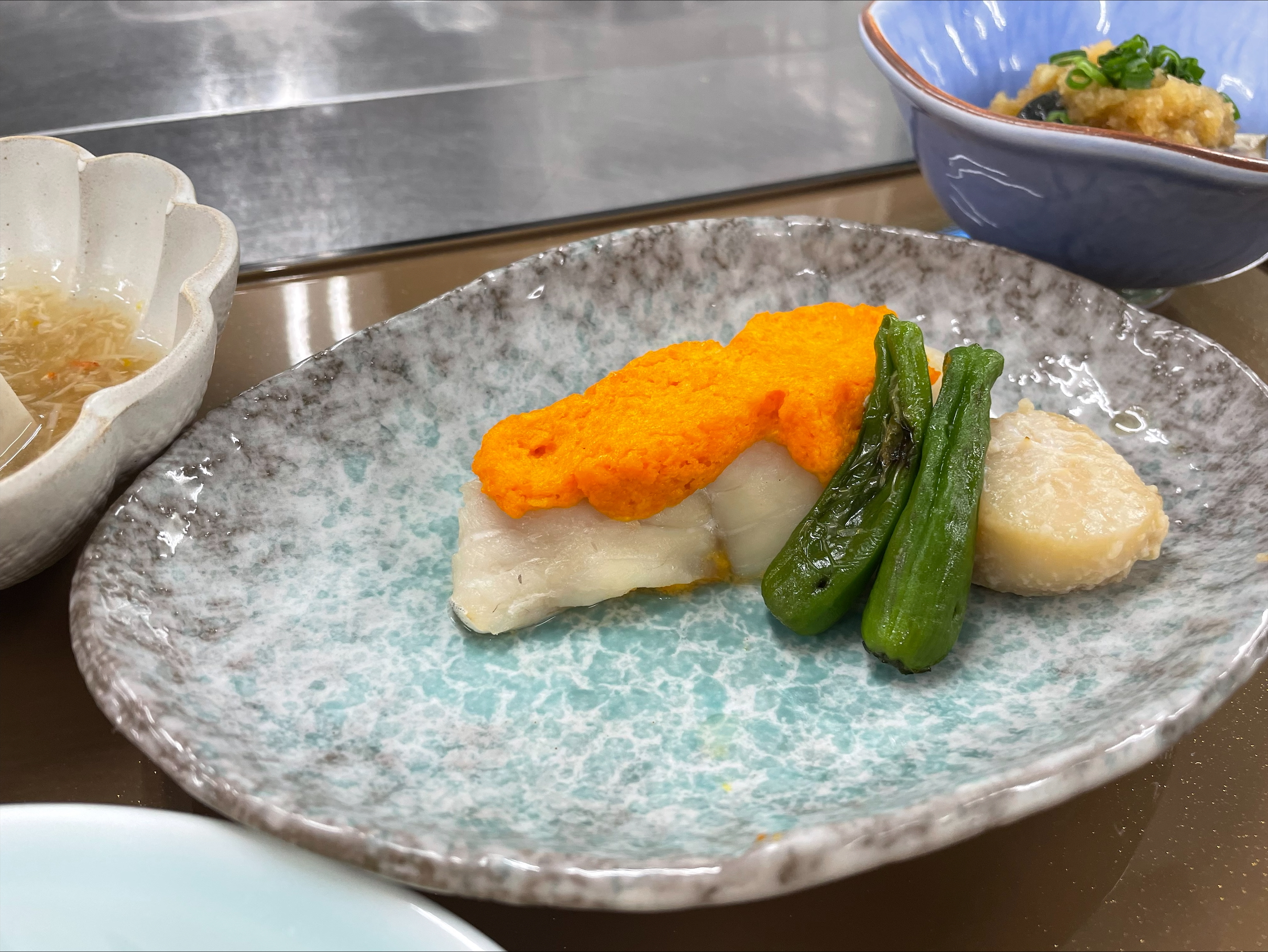 鱈の曙焼きは、冬が旬の鱈を曙焼きで春の訪れを表現しました。曙焼きはすりおろした人参とマヨネーズを合わせ焼いた料理で、春には曙焼き、秋にはもみじ焼きと呼ばれます。