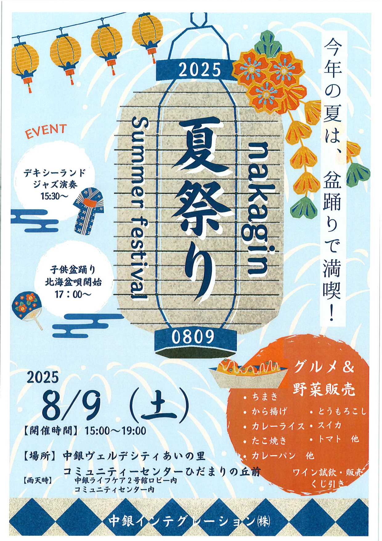 毎年、中銀ライフケア札幌[1号館・2号館]を含む、中銀ヴェルデシティあいの里では、「納涼祭」を8月末頃に開催しておりました。 それを今年は刷新、「夏祭り」と名称と開催時期を変更し、あいの里町内会と合同で盆踊りイベントを開 … 続きを読む あいの里 夏祭り“盆踊り”