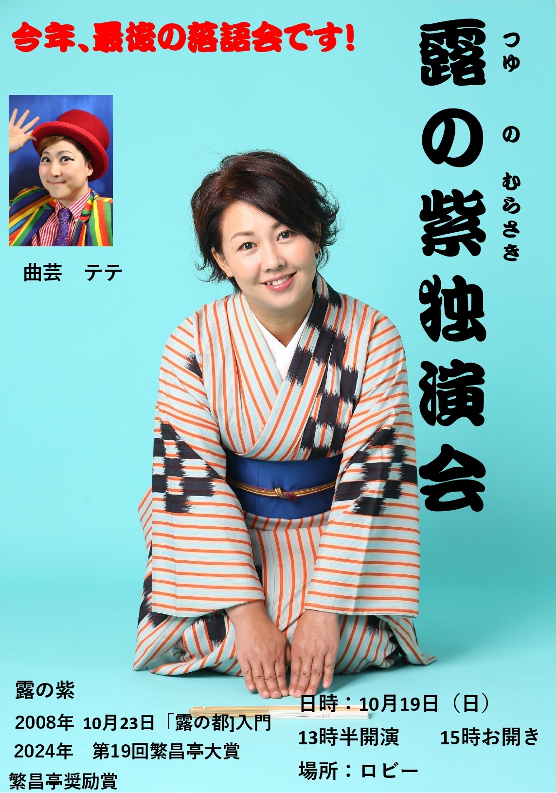 10月19日(日)13:30より、中銀ライフケア平岸天神山のロビーにて、大阪からお越しの魅力的な女性落語家「露の紫(つゆのむらさき)」さんによる独演会が開催されました。 まずは紫さんによる「落語の楽しみ方講座」からスター … 続きを読む 今年最後の落語会