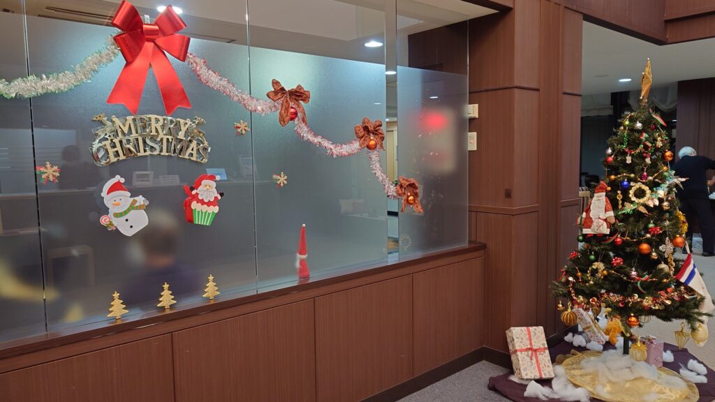 今年は一段と華やかで、受付前のガラス壁にはサンタクロースや雪だるまの飾りが並び、訪れる方々を優しく迎えてくれています。