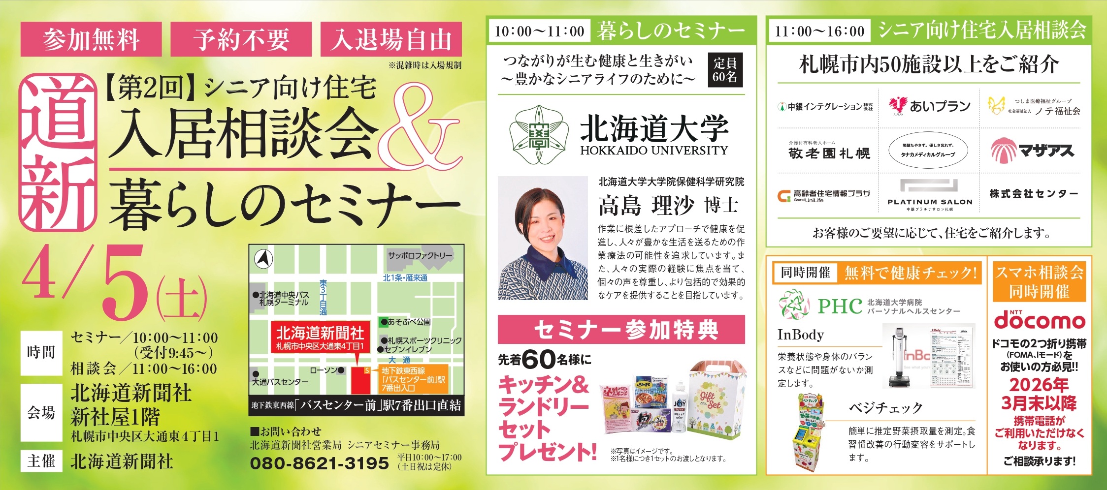 2025.3.17 【第2回】道新シニア向け住宅入居相談会&暮らしのセミナー 豊かなシニアライフのためのセミナーと、 札幌市内50施設以上のシニア向け住宅をご紹介。 【参加無料】【予約不要】【入退場自由】 ■開催期間:4月5日(土) ■開催時間: (セミナー)10:00~11:00 (相 談 会)10:00~16:00 ■会 場:北海道新聞社 新社屋1階 ●地下鉄東西線「バスセンター前」駅 7番出口直結